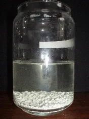 右の写真は生分解樹脂(バイオポール)のペレットをガラス容器内の水中に漬け込んだものです。