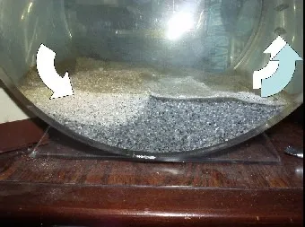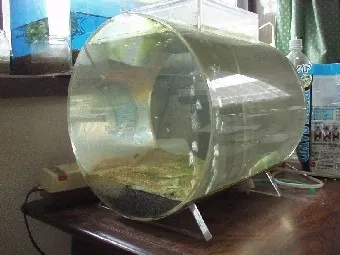 右側の写真は水槽の底砂の部分を側面から撮影したものです。水槽内は小さなエアレーションのみで、円筒の内面に沿った循環流が起きています。