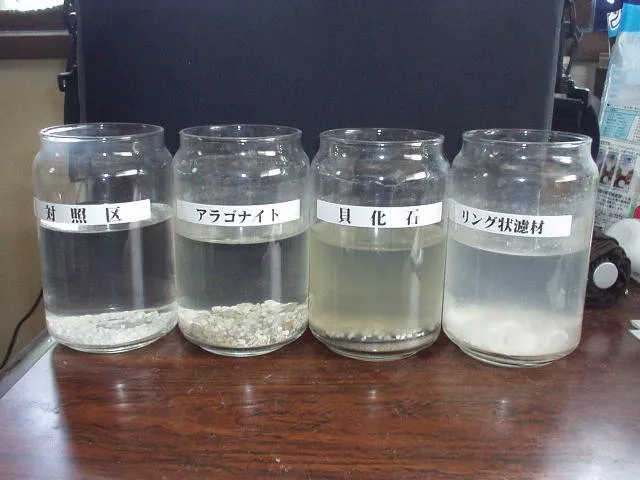 貝化石と異なるところはリング状濾材は白い色を保ったままで、硫酸還元の発生を意味する黒化現象が全くないことです。