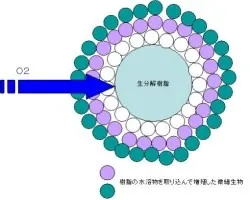 当初樹脂の直近に住み着いた微生物が、好気下でしか生きられない種であるならば、やがてコロニーの内奥部は酸素の供給の少ない彼らの生存に適さない環境となり、その多くが死滅することになります。