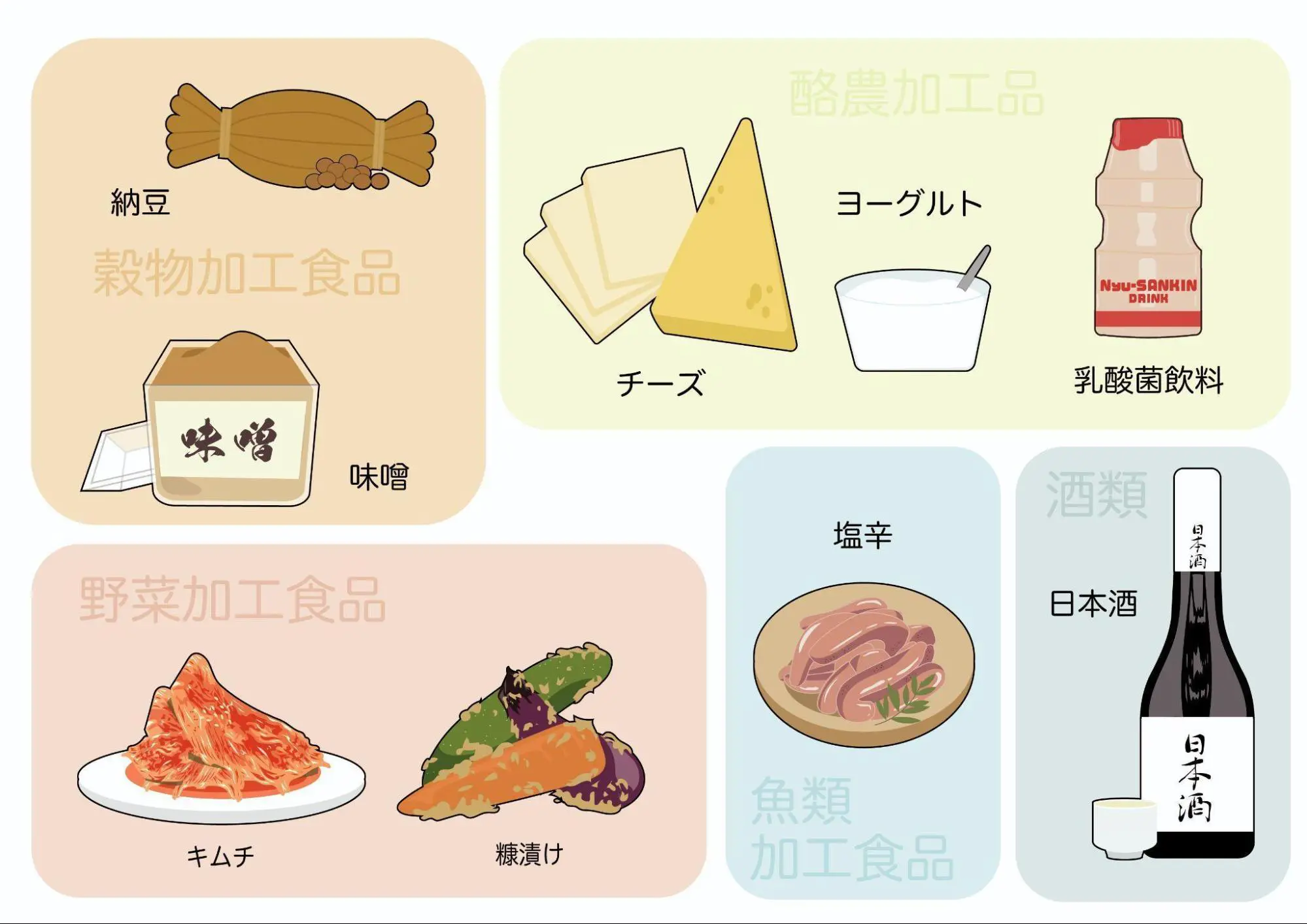 チーズやヨーグルト、納豆に漬け物、味噌・醤油・味の素(味の素も発酵技術を用いて菌が作り出しているのです)。