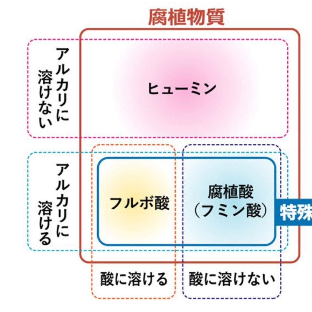 腐植土から作り出された腐食物質には大きく分けて フルボ酸 と フミン酸 とがあります。