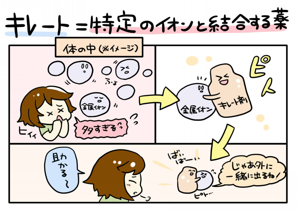 キレート剤にはいくつかの種類があり、有害金属の種類によってそれぞれ適切なキレート剤が使われます。