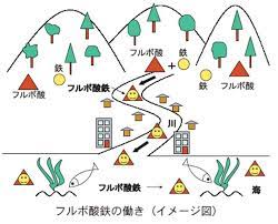 す。川の水の起源は山に降った雨水が地表や地下を通ったものです。これらの水が山中に堆積した腐植土を通過する際にフルボ酸やフミン酸でキレートされた鉄を運び出すのです。