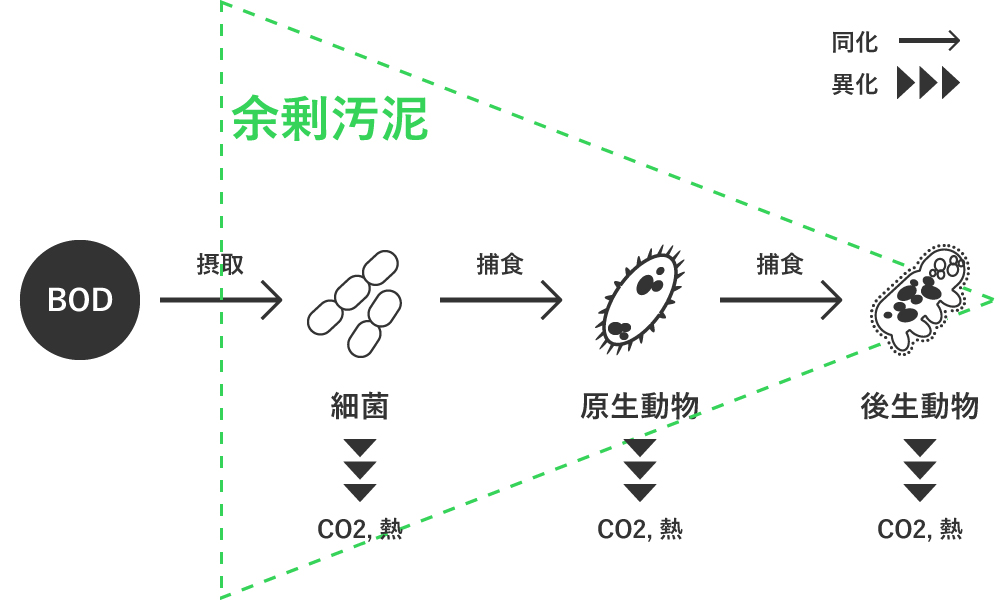 【有機物】+【窒素】+【リン】+【エネルギー】 ➔ 【新しい微生物の細胞(汚泥)】